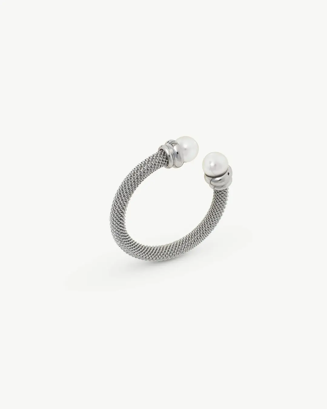 Открытое кольцо из стали с белыми круглыми жемчужинами диаметром 4 мм.