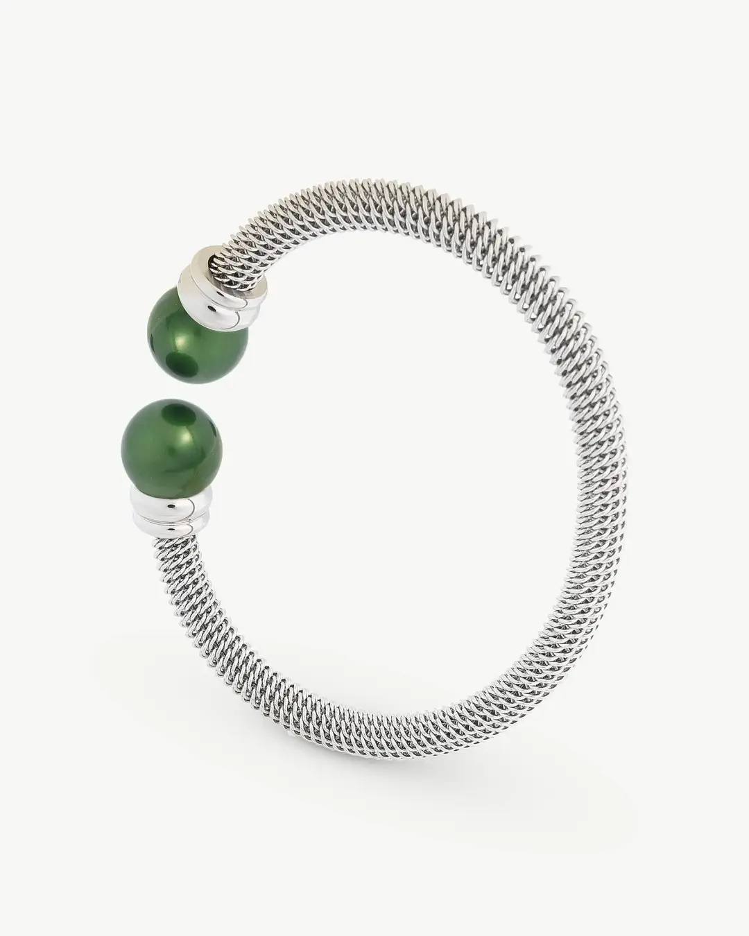 & Free ShippingЖесткий стальной браслет, зеленые круглые жемчужины диаметром 12 мм.