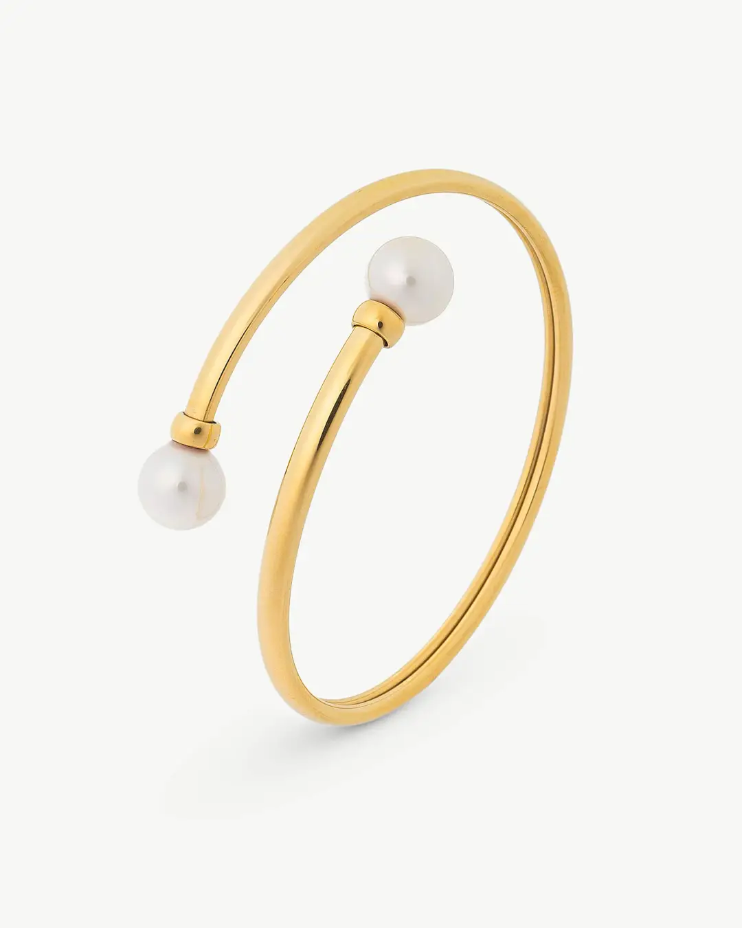 Жесткий овальный браслет 58 мм из золотистой стали, белые круглые жемчужины 9 мм. Коллекция украшений из нержавеющей стали, заявление о тенденциях.