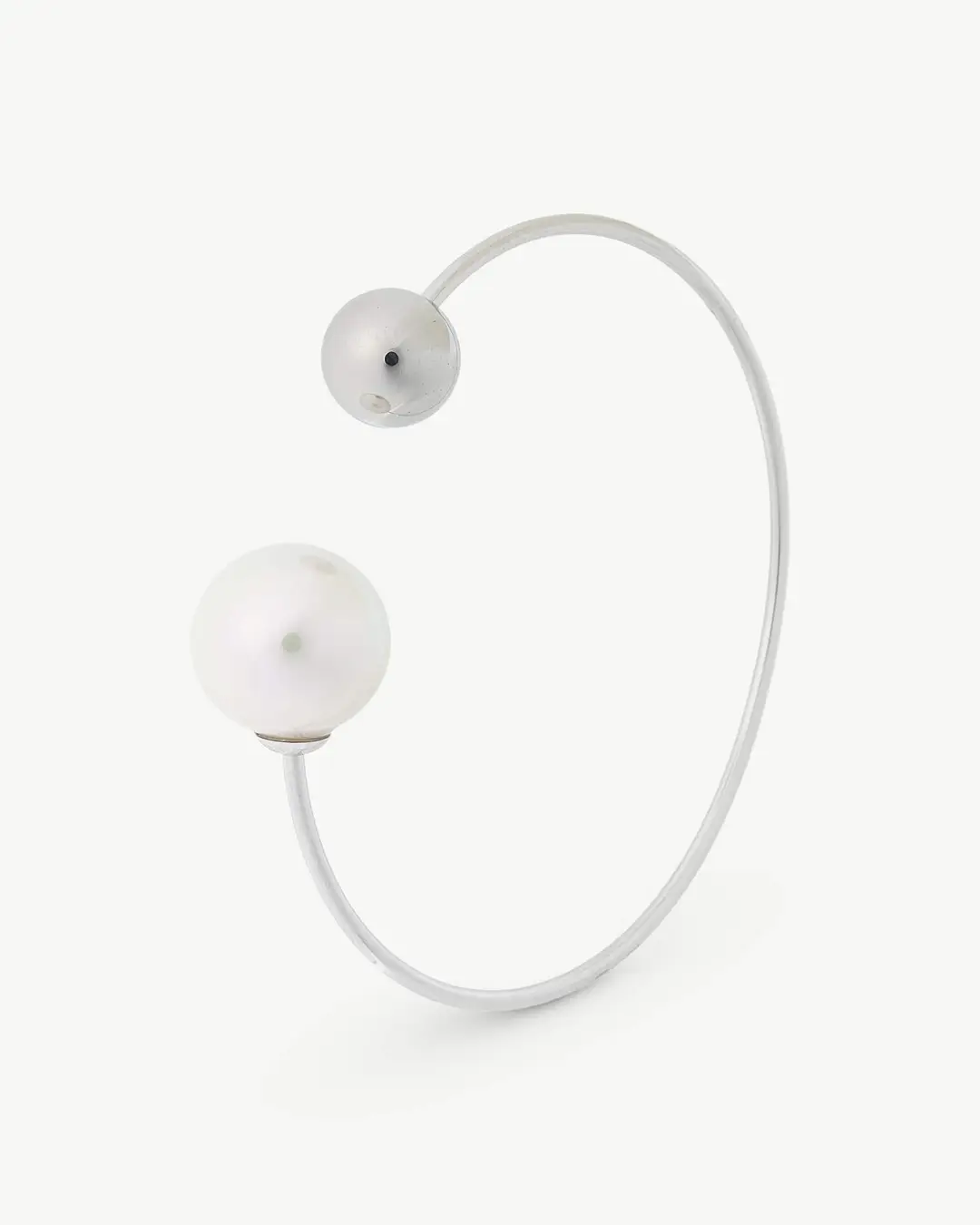 & Free ShippingЖесткий браслет 58×46 мм из стали и титана с родиевым покрытием, белая круглая жемчужина 14 мм и металлический шарик.