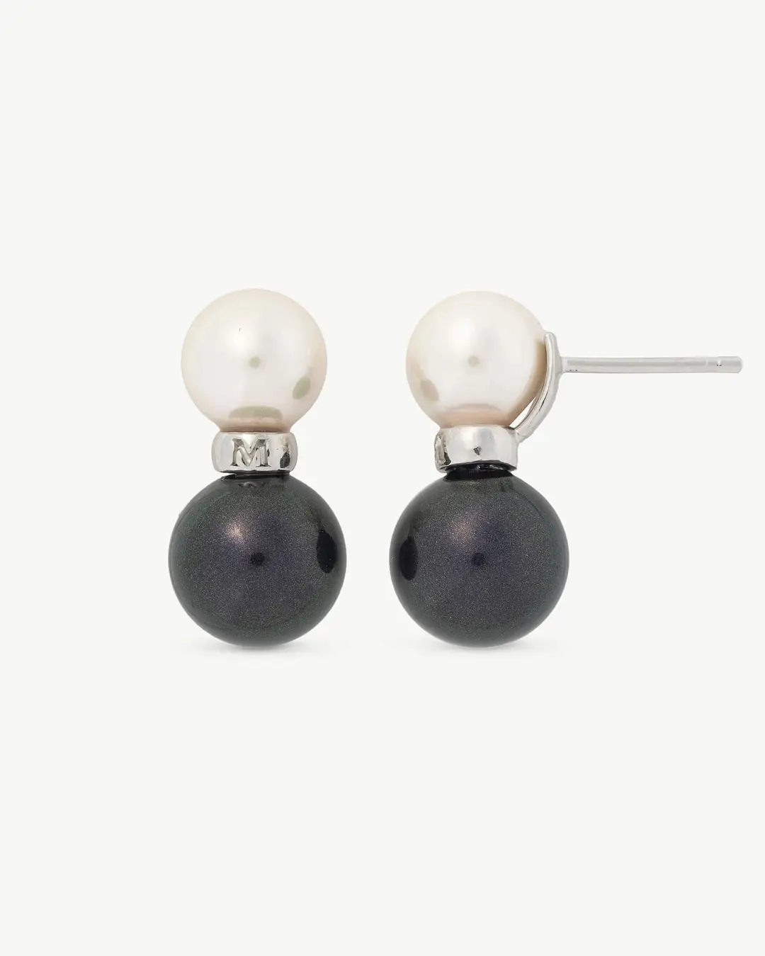 & Free ShippingСеребряная серьга с застежкой-шипом. Двойная белая и черная жемчужина 8 и 10 мм.