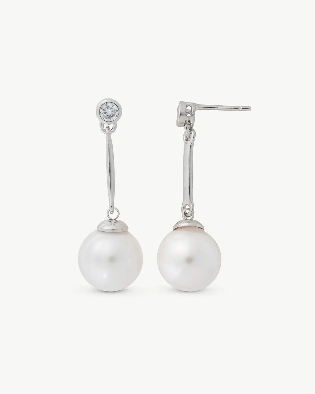 & Free ShippingКороткие серьги-гвоздики из родированного серебра с белым круглым жемчугом 10 мм и цирконами. Украшения на каждый день.