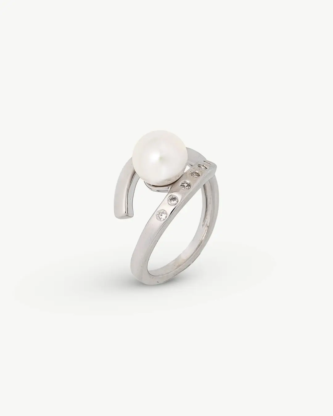 & Free ShippingОткрытое кольцо из родированного серебра, 8 мм белая круглая жемчужина и цирконий. Украшения на каждый день.