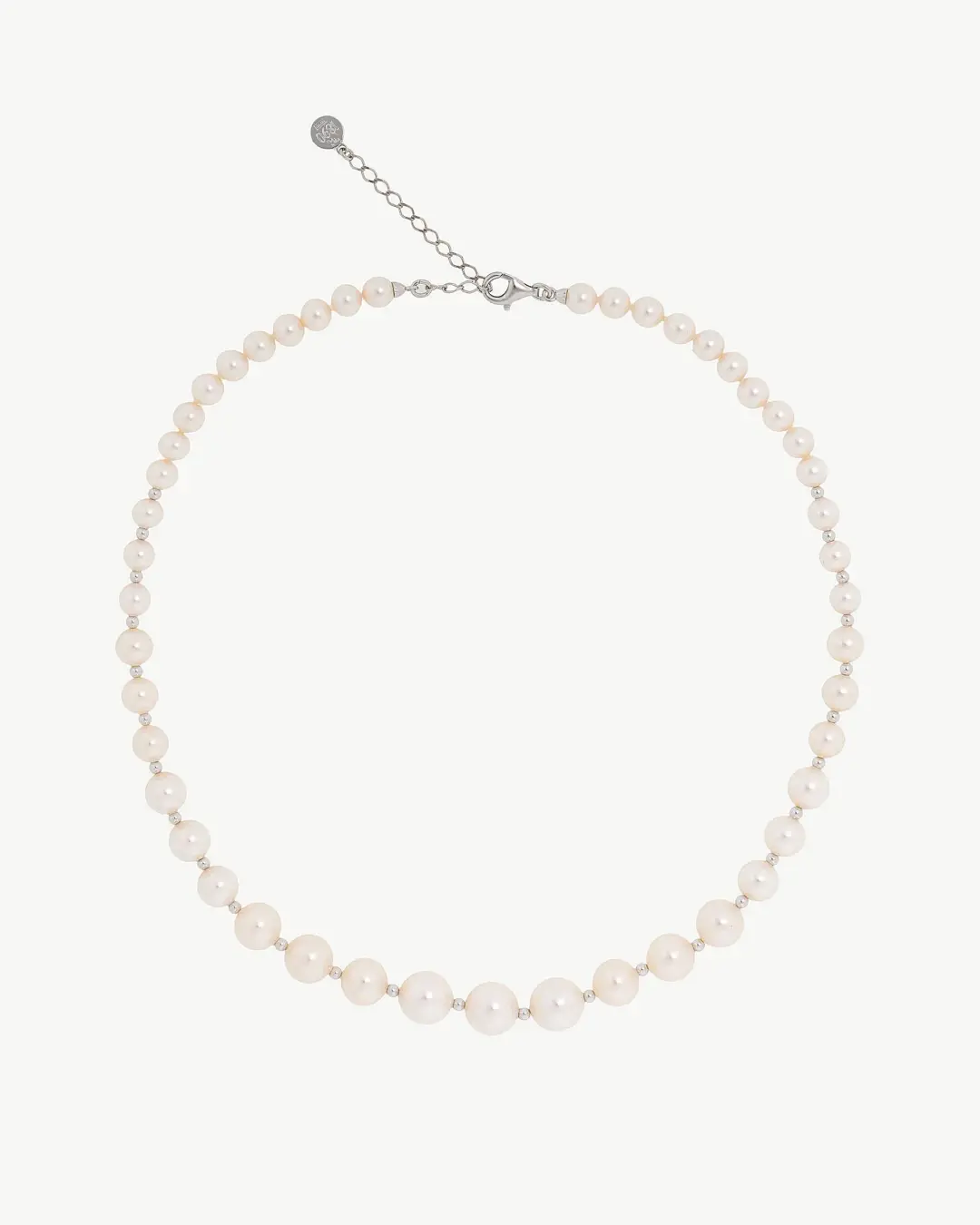 Колье 43/48 см из родированного серебра, 6/7/8/9/10 мм белого жемчуга. Если вы ищете выбор базовых украшений для своей шкатулки: эти серьги из коллекции — «обязательно», они сочетаются со всеми образами и моментами.