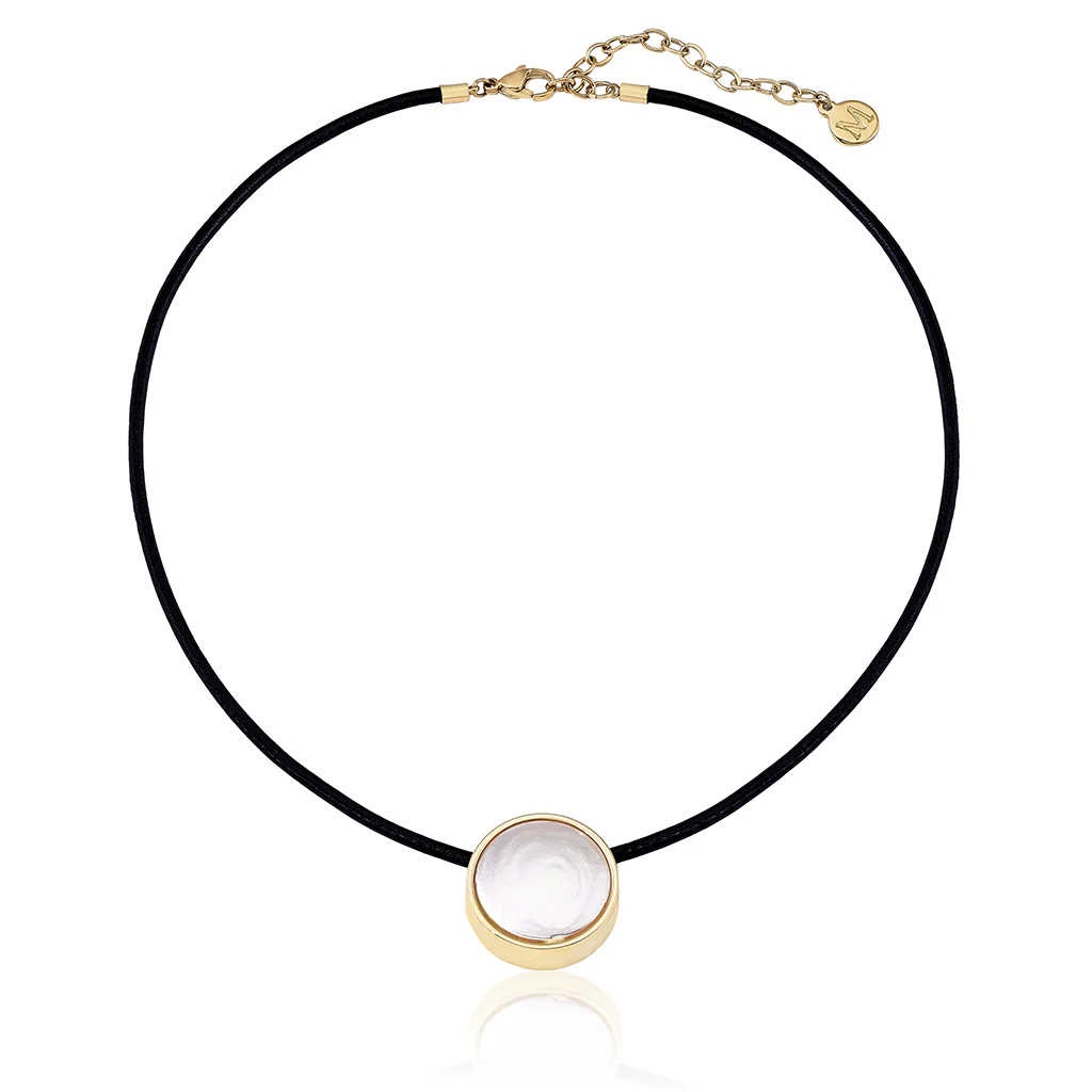 & Free ShippingКороткое ожерелье длиной 40/46 см из золотистой стали и черной кожи с плоской белой жемчужиной диаметром 20 мм.