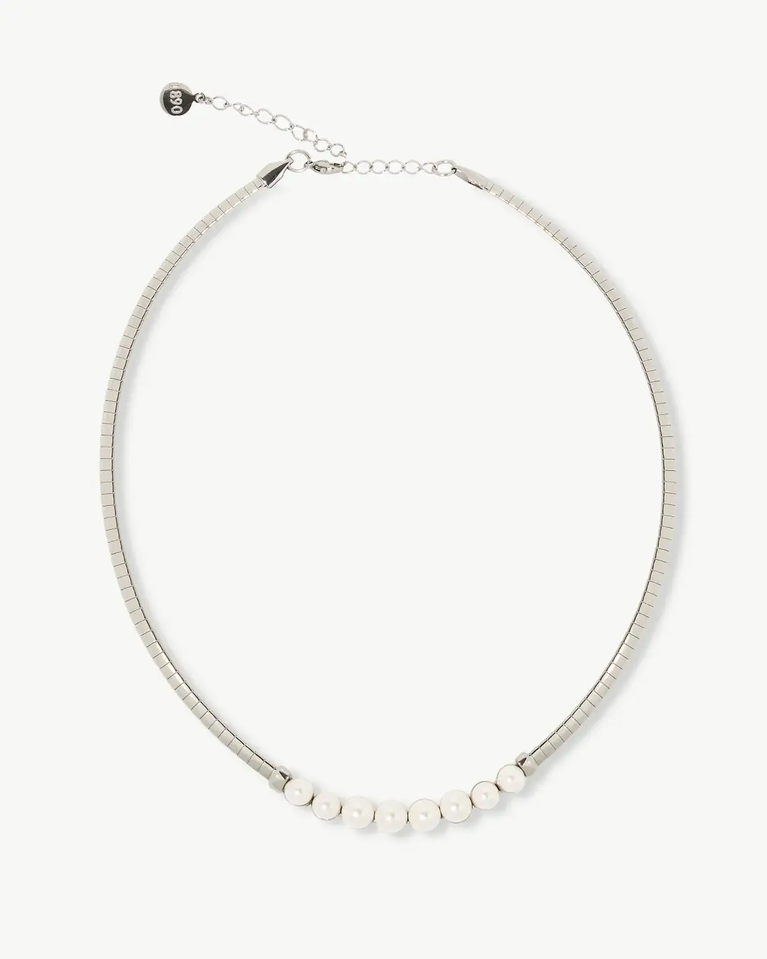 Короткое регулируемое ожерелье (37/43 см) из родированной стали с круглыми белыми жемчужинами диаметром 6-7 мм.