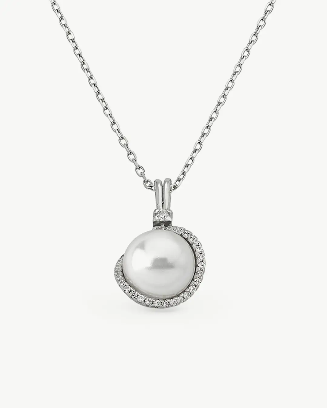 Серебряная цепочка с родиевым покрытием. Длина регулируется от 37 до 42 см. Подвеска с круглой жемчужиной диаметром 12 мм, окруженной цирконами.