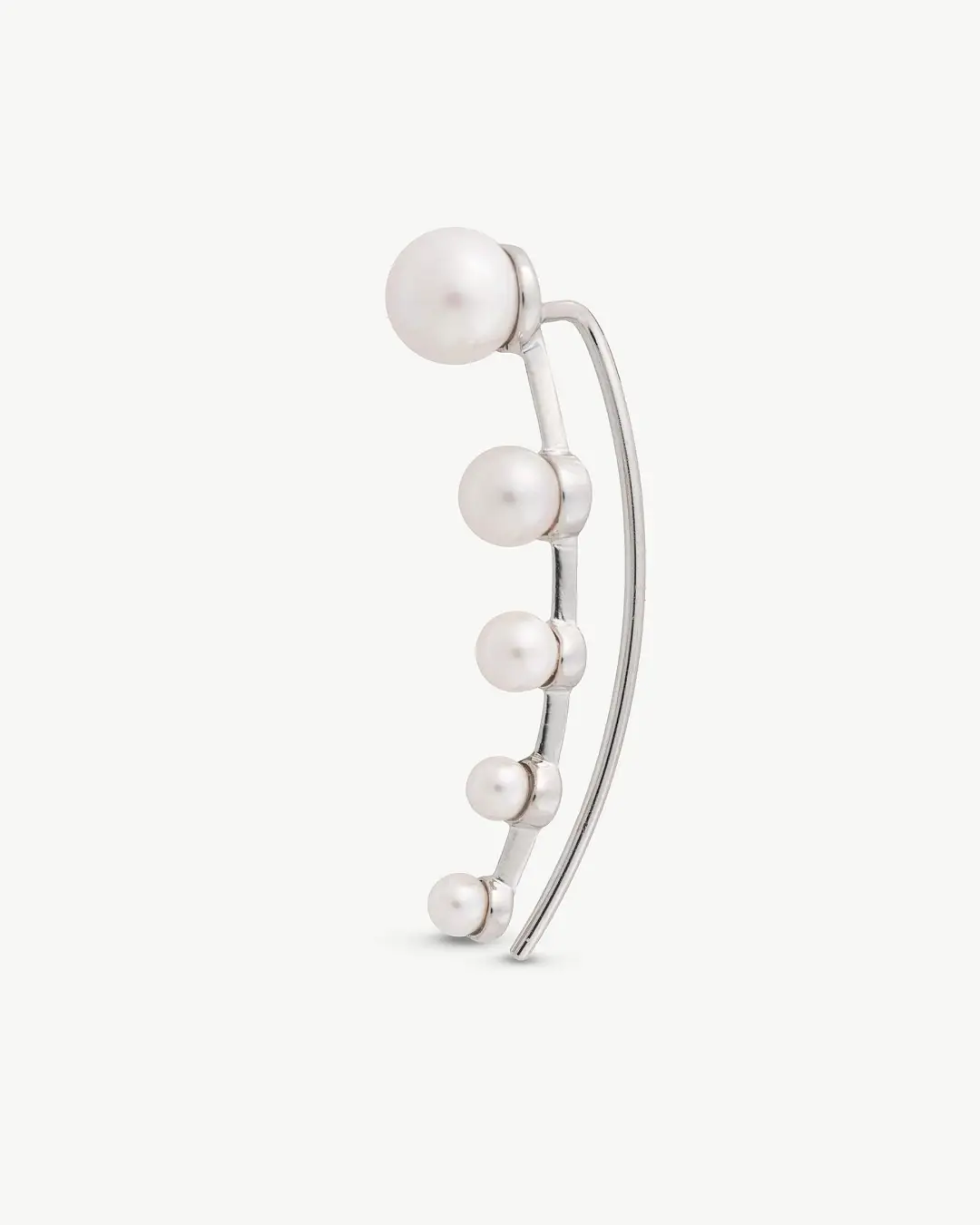 & Free ShippingСеребряная серьга-альпинистка. 5 круглых белых жемчужин 3, 4,5 и 6 мм. Правое ухо. Украшения для особых случаев, идеальный аксессуар для свадьбы.