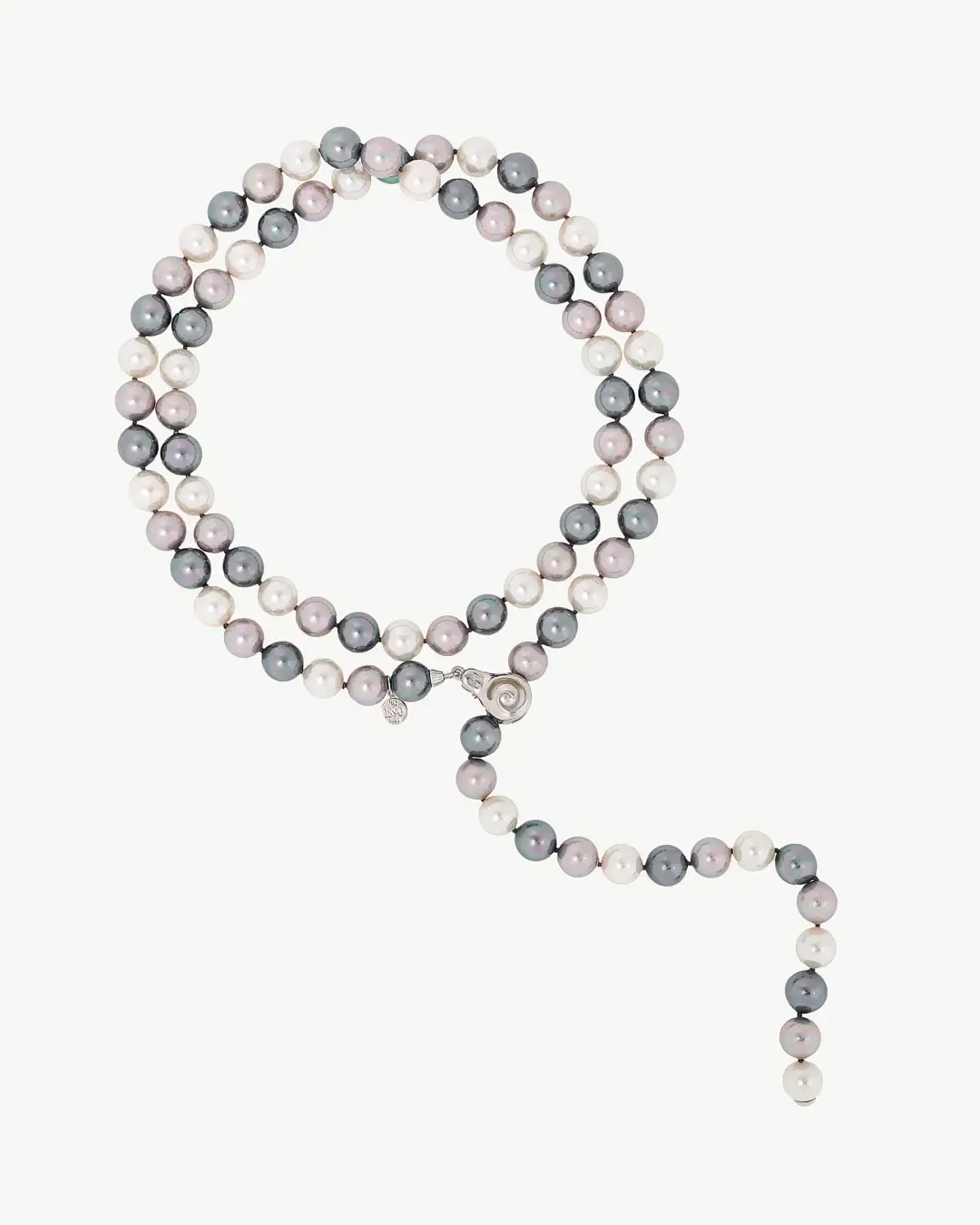 Ожерелье длиной 90 см с многофункциональной застёжкой из родированного серебра с круглыми белыми, серыми и разноцветными жемчужинами диаметром 10 мм. Классика, которая никогда не выходит из моды.