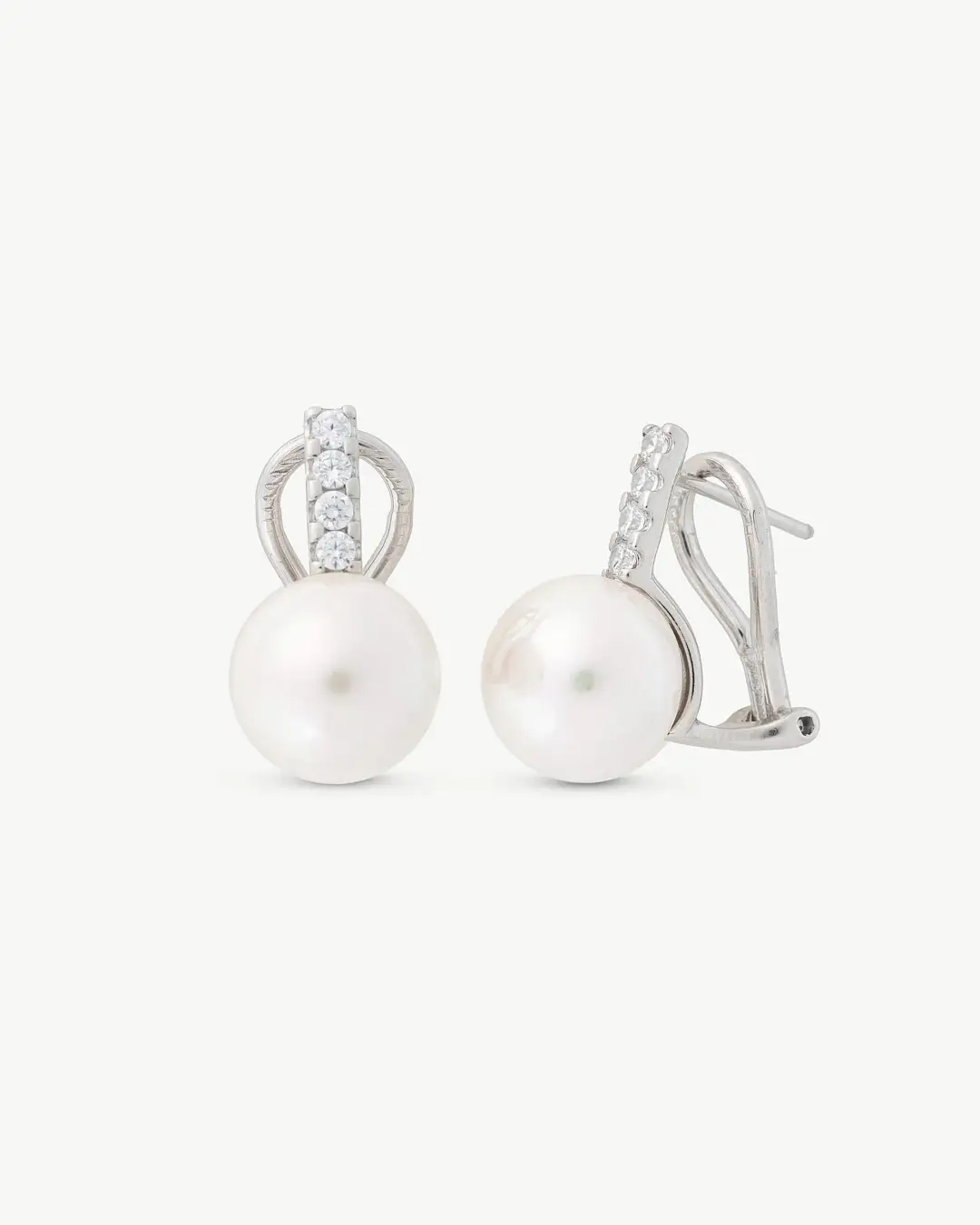 Серебряные серьги с застёжкой омега, круглой белой жемчужиной диаметром 10 мм и фианитами. Эти серьги «Ты и я» идеально подойдут на каждый день.