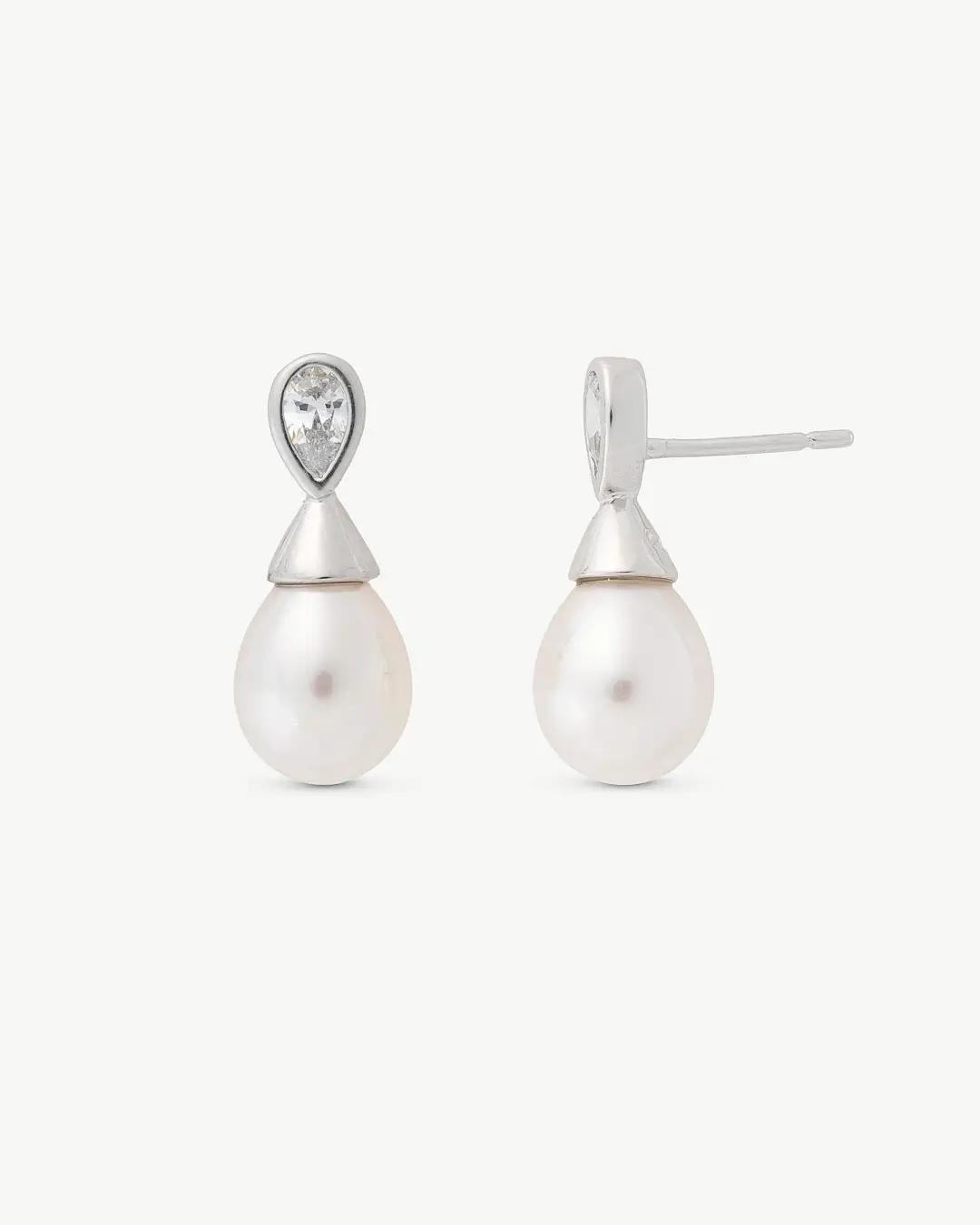 Короткие серьги-шипы из родированного серебра, 8×10 мм белых грушевидных жемчужин и цирконы. Украшения на каждый день.