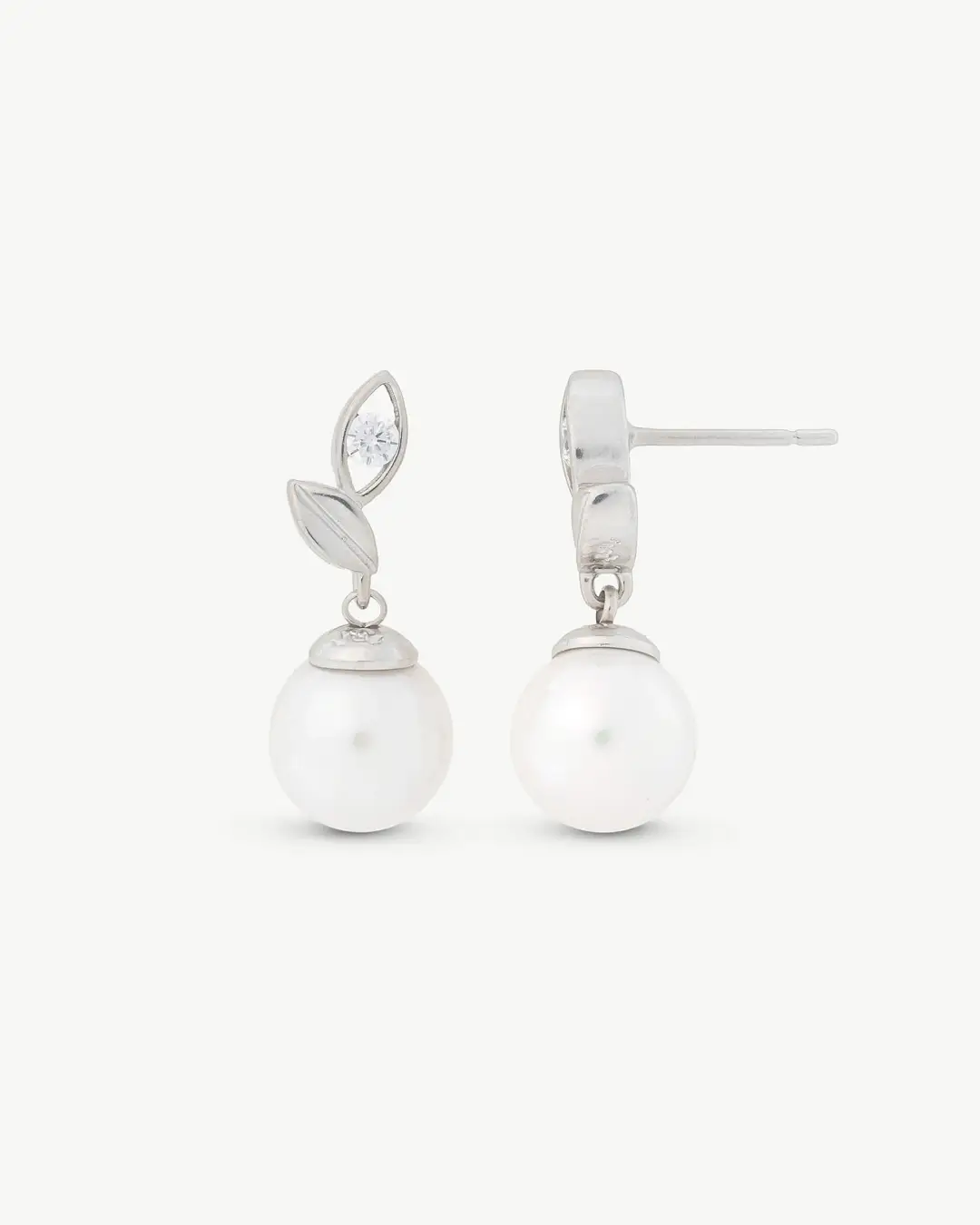 Короткие серьги-шипы из родированного серебра, 8-миллиметровые белые круглые жемчужины и цирконы. Украшения на каждый день.
