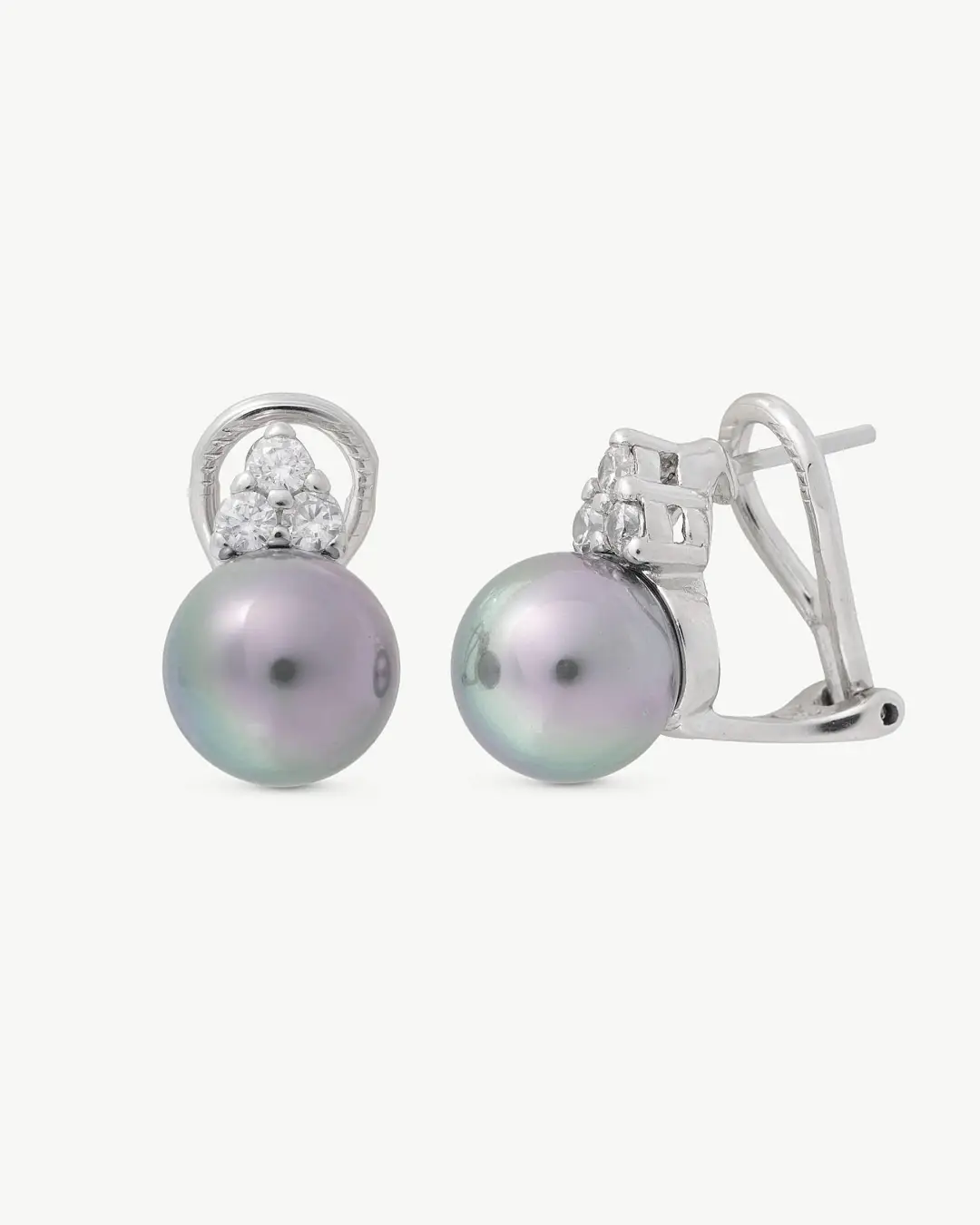 Серьги с жемчугом и 3 фианитами, серая селена, 10 ммСерьги с жемчугом и 3 фианитами, серая селена, 10 мм