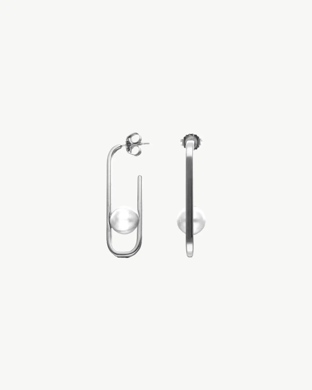 Длинные серьги-гвоздики из родированного серебра с круглой белой жемчужиной 10 мм. Созданы для творческих и новаторских личностей и стилей.