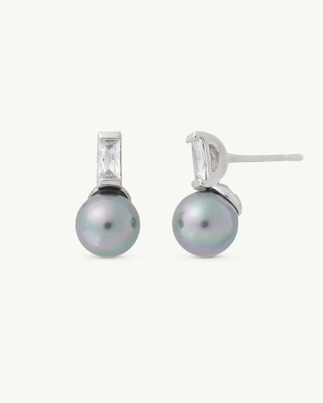 & Free ShippingКороткие серьги-шипы из родированного серебра, 8-миллиметровые серые круглые жемчужины и цирконы. Украшения на каждый день.