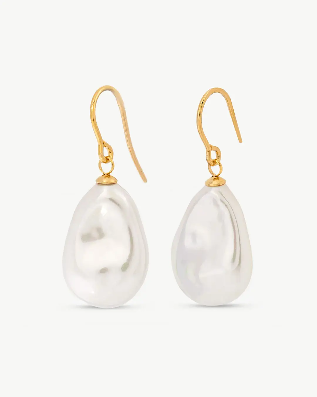 Серьги длиной 3,5 см с шипом из 18-каратного позолоченного серебра, с дикой жемчужиной 14×20 мм.