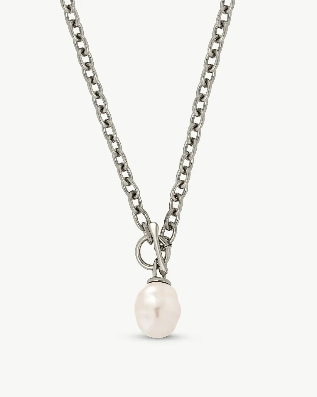Стальная цепочка длиной 48 см с подвеской и белой барочной жемчужиной 14 мм.